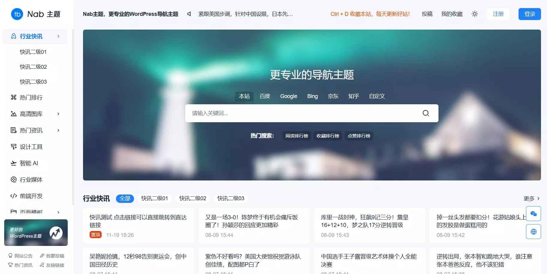 NAB主题是一款侧重于轻量型网址导航站的WordPress主题,支持全站SEO设置、文章图片弹窗、百度收录、多语言、一键换色,适用于各种集合类、网址类、导航类网站,扁平化设计、多设备支持、侧栏随动、列表无限加载、灵活多变的小工具模块。
